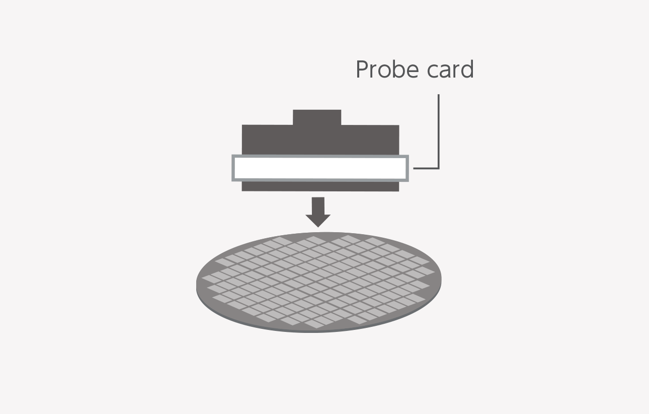 Our product lineup for the semiconductor manufacturing process includes probe cards for testing the electrical properties of wafers, testing equipment called IC testers and test sockets for property testing after packaging, as well as a wafer prober, which is used for evaluation and analysis during R&D of devices. As the functionality and diversity of semiconductors advances, we are supporting the enhancement of productivity and quality with our highly reliable testing and measurement technologies.