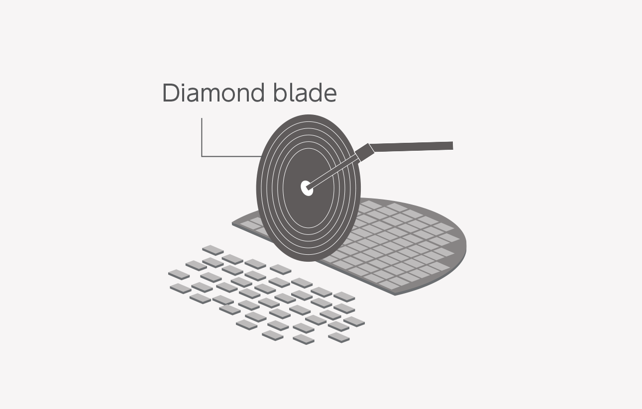 The IC chips are cut from the wafer every few millimeters and encapsulated in a package using a resin mold.