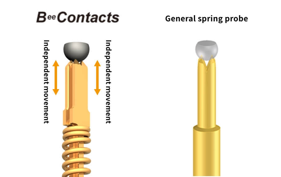The BeeContacts is designed to enable two plungers to move independently for multi-point contact. Due to the distinctive structure, the sharp plunger edges conduct self-cleaning with micro scrub movements and break through the oxidized film and foreign materials on the solder surface to achieve superior, stable contact.