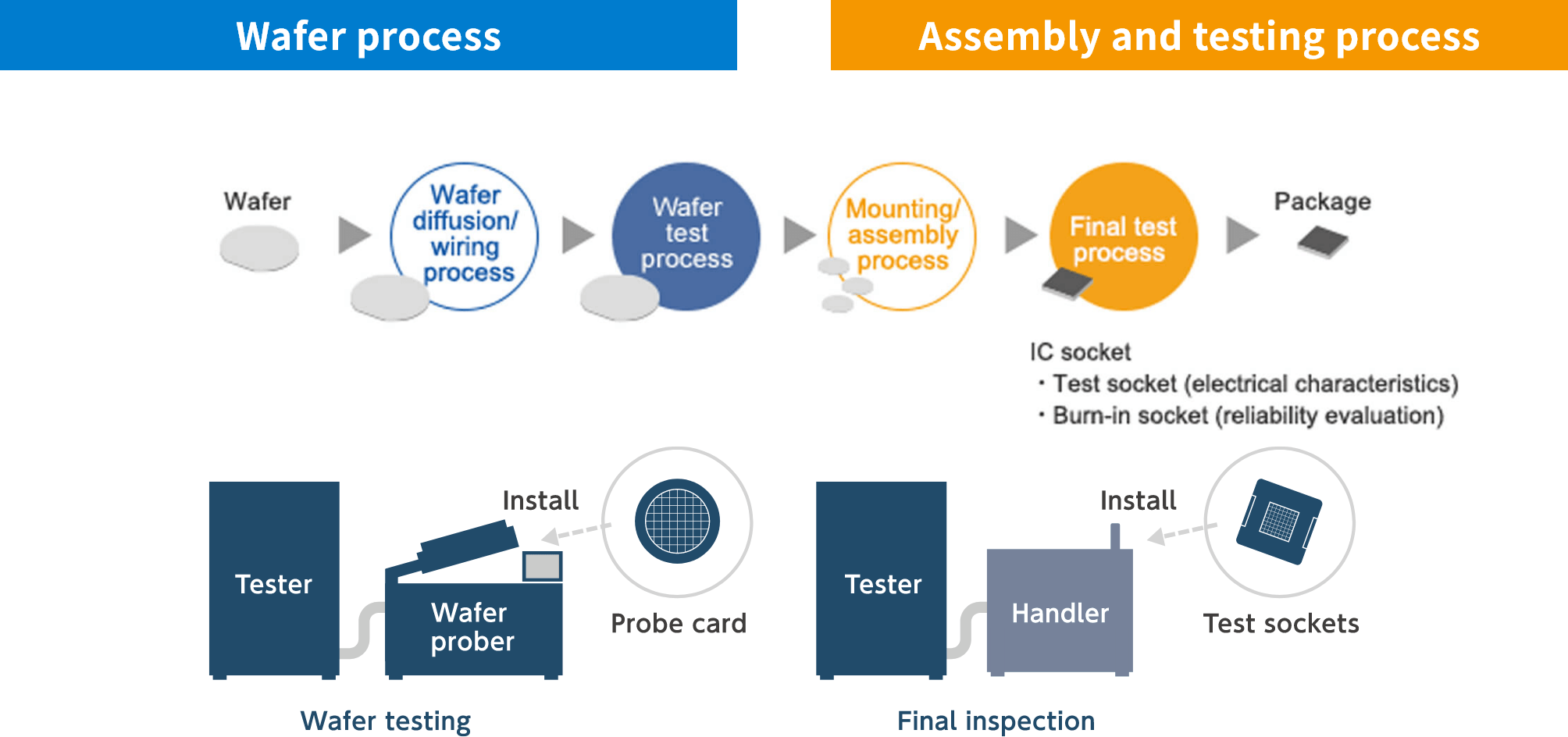 One is the wafer test during the wafer process, in which electrical characteristics of chips are tested before dicing a wafer into many pieces of semiconductor (called dies or chips). The other is the final test during the assembly and testing process, which is conducted after packaging the diced chips.